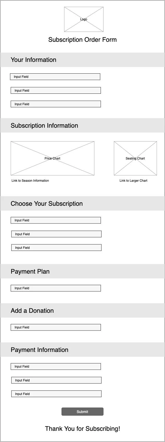 Once settled on the platform I created a simple wireframe of the form based on the fields available on the paper subscription form. I then worked to brand the form and match the theatre’s website colors and fonts as closely as possible.